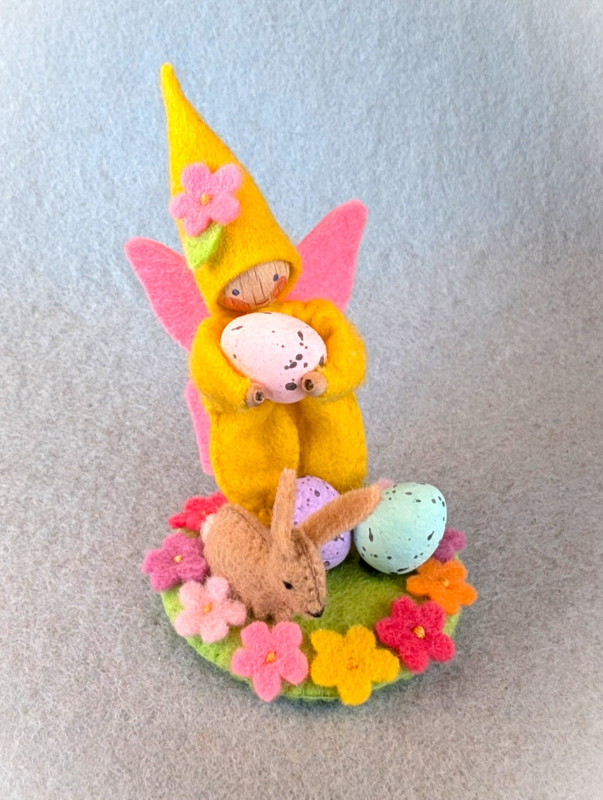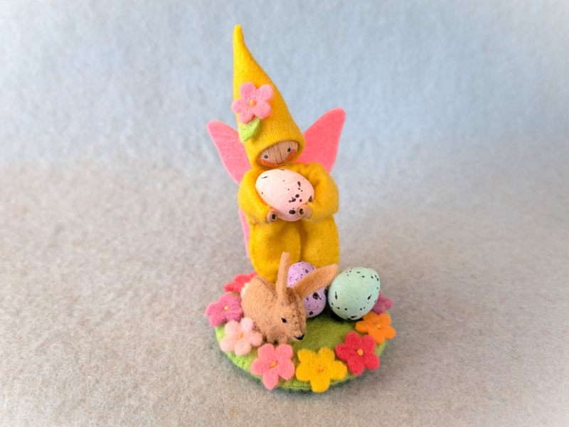 Deze Paaskabouter is een lief, fluffy kaboutertje met kleine vleugeltjes en is ongeveer 9 cm groot, de eieren 2 cm,