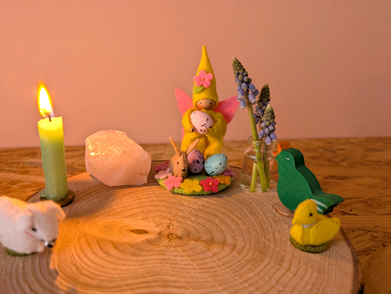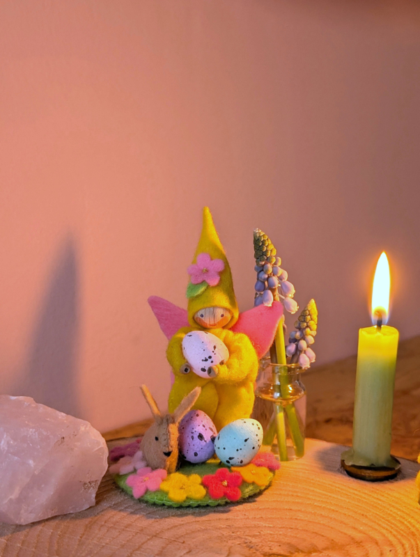 Maak het tafereel helemaal eigen door er (chocolade- of kunst)eitjes bij te leggen. Heb je nog restjes vilt in huis? Dan kun je nóg meer kaboutertjes maken en ze gezellig in de paastak of paaskrans hangen.