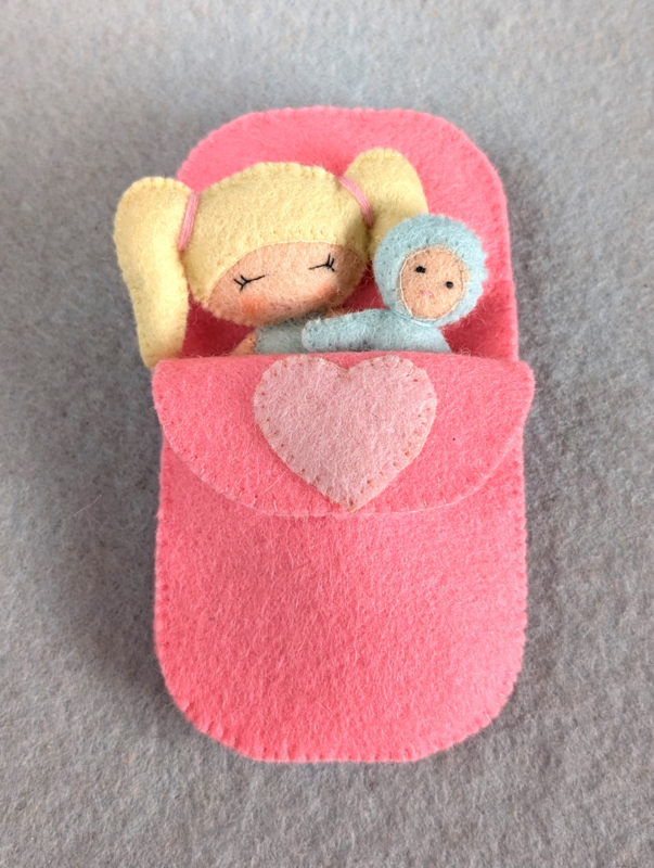 Dit lieve kindje van 11 cm verovert je hart en nodigt uit tot een fantasierijk spel en mooie avonturen. Na een lange speeldag kan ze in haar zachte bedje gestopt worden, samen met haar popje of beertje. Onder het hartje op het bedje is een geheim vakje waar je ook nog kleine schatten in kunt bewaren. Een veelzijdig ontwerp dus.