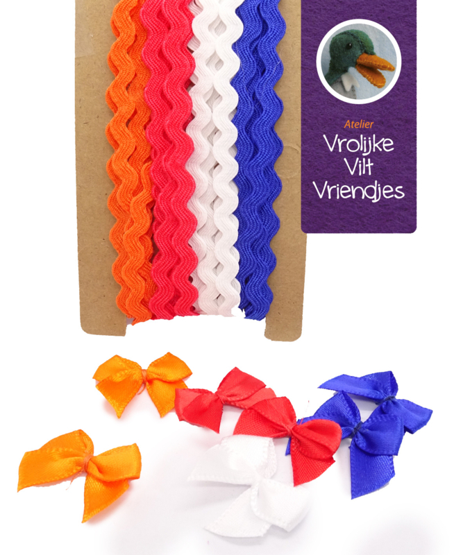 1 meter rood-wit-blauw- oranje zigzaglint en van iedere kleur 2 strikjes